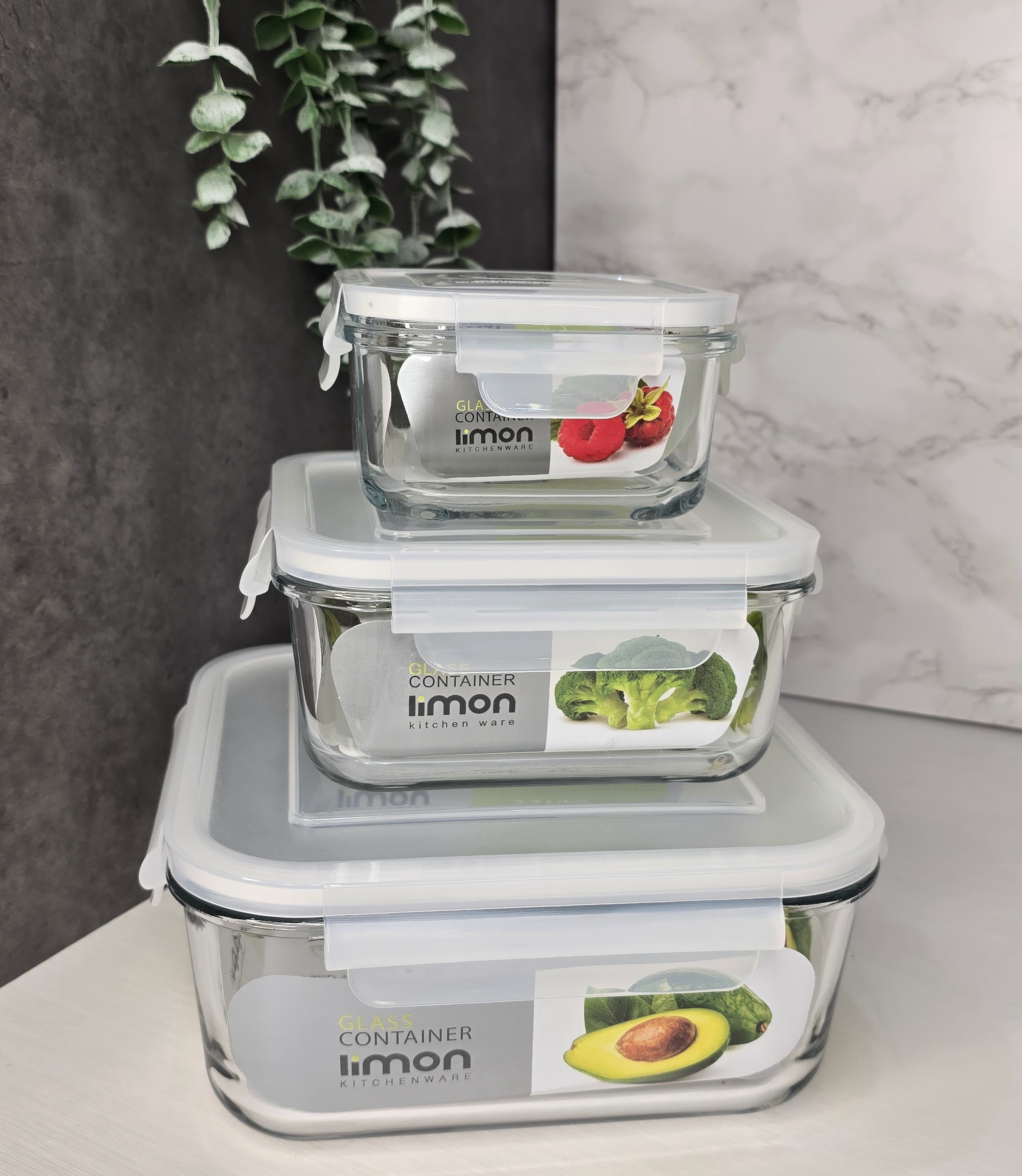 ظروف ۳ عددی شیشه مربعی قابل استفاده در مایکروفر حجم بزرگ :۲.۳میلی لیتر حجم متوسط:۹۵۰میلی لیتر حجم کوچک :۴۴۰میلی لیتر